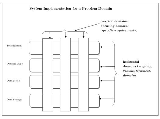 Complex software systems consist of several concerns such as, performance, reliability , fault-tolerance, persistency. Hence, domain specialization is required to capture these concerns precisely and to perform various analyses specific to the domain. DSLs , thus reduce the complexity of complex systems by providing high level linguistic abstraction through succinct syntax and by isolating concerns from one another which additionally results in highly cohesive sub-systems. Following figure illustrate the fact that DSLs covers various concerns of complex software systems vertically rather than horizontally.
